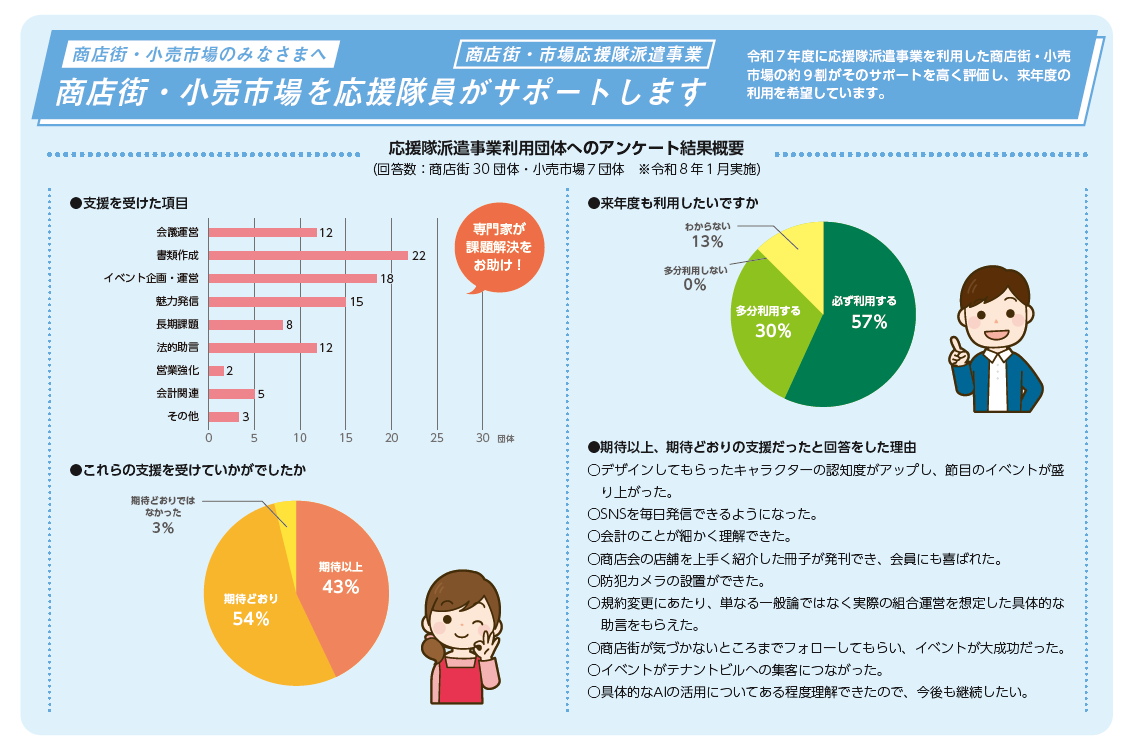 NO.42 令和8年度 商店街・市場「応援隊」派遣事業利用アンケート結果 商店街・小売市場を応援隊がサポートします!! アンケート結果概要 回答数: 商店街30団体 小売市場7団体 令和8年度に応援隊を利用した商店街・市場の約9割がそのサポートを評価し、来年度の支援を希望しています。 応援隊の一覧は→こちら 活動記録(一部)は→こちら に掲載しております。 ※画像のタイトル部分に令和7年度と記載がありますが、正しくは令和8年度です。記載内容が誤っており申し訳ございません。